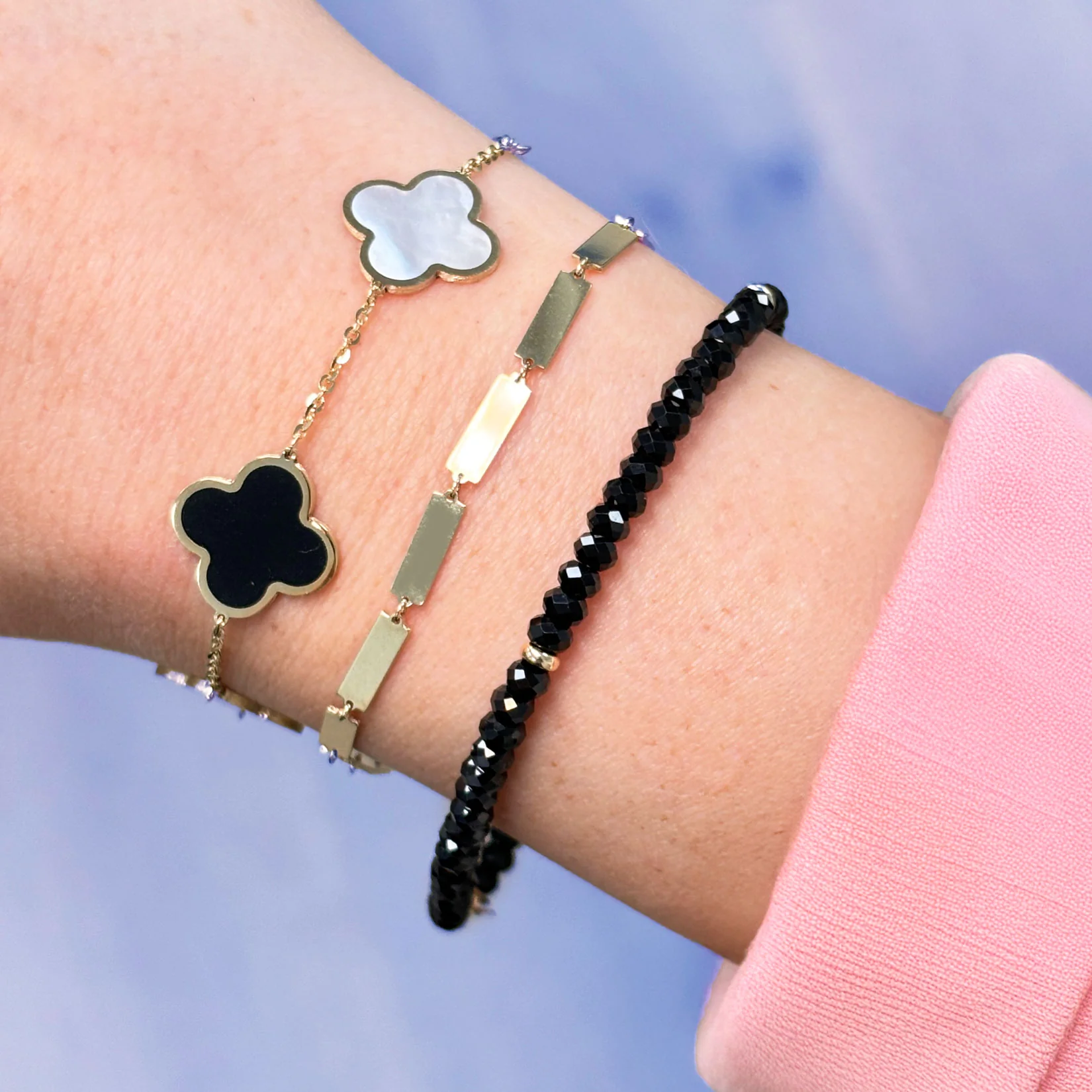The clover bracelet is our go-to piece to add to any look! Now in our highly requested large size, this bracelet is the perfect statement piece! Dress it up with a cocktail dress and heels, or dress it down with your comfiest loungewear. Either way, you'll be classic chic!